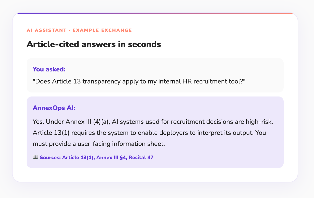 The AI Compliance Assistant answers EU AI Act questions in plain English, cites the specific article and recital that creates each obligation, and links directly to the relevant section of your compliance record.