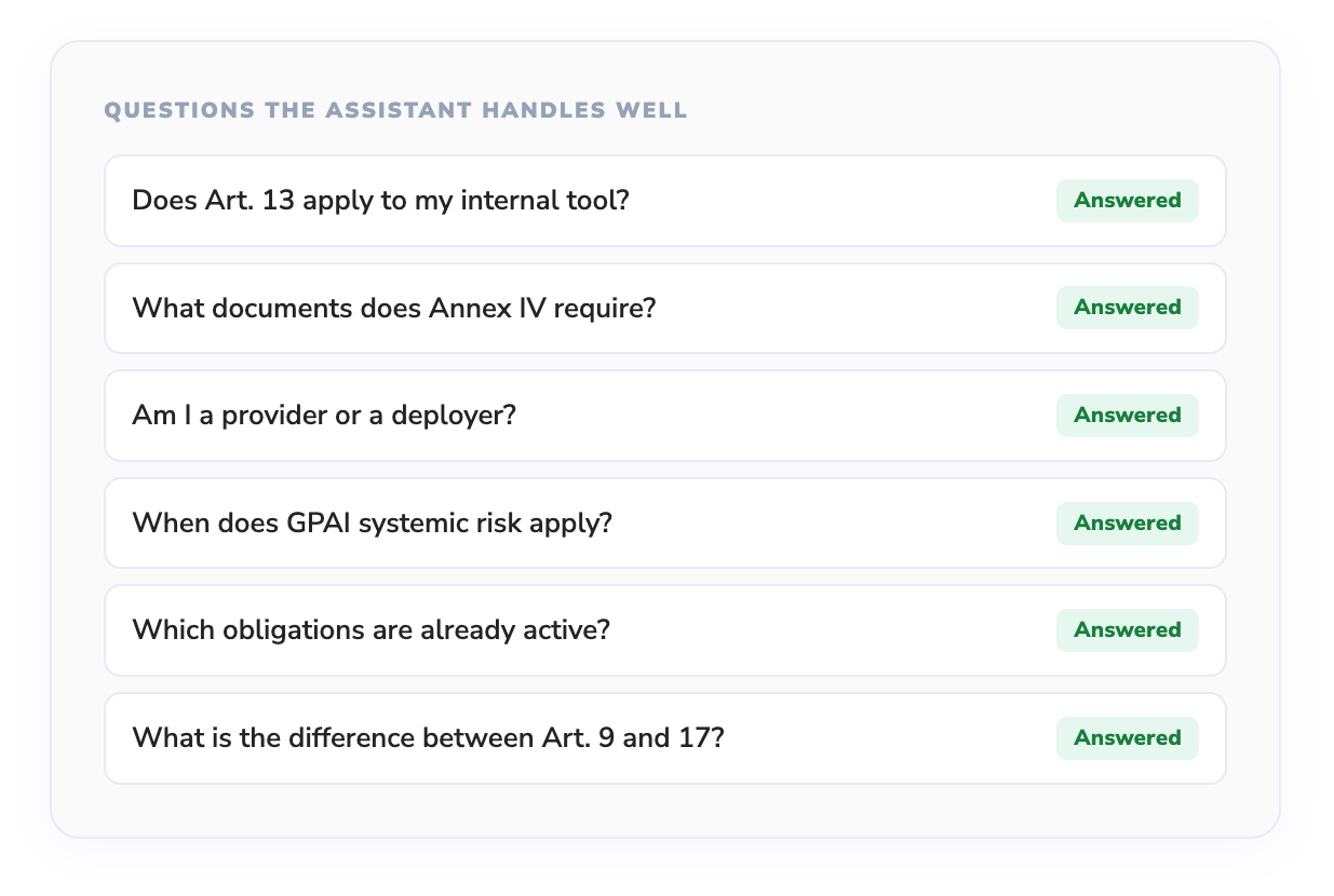 Answer EU AI Act questions in German and Dutch from launch. French support in Phase 2. Critical for teams working in non-English speaking EU markets.