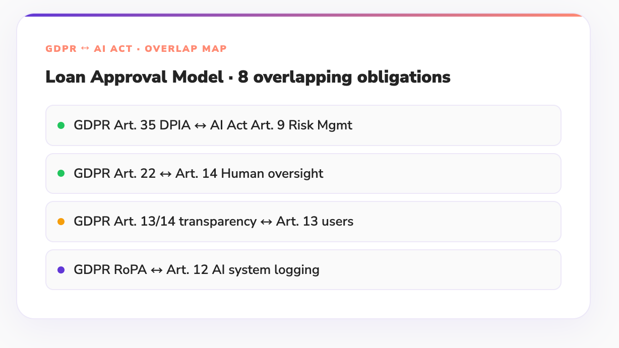 No other compliance tool maps the intersection of GDPR and the EU AI Act for the same AI system in a single workflow. Stop managing two separate compliance processes for obligations that overlap by over 60%.